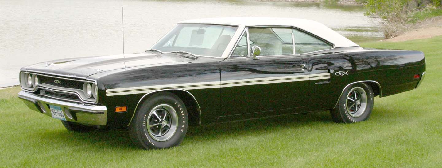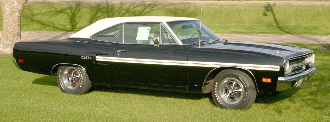 This month's 1970 GTX is owned by Darwin Leis of North Dakota. It is a rare black 1970 GTX with white vinyl top and matching white interior. Other options were AM/8 track radio with three speaker front dash with the rear seat speaker, hood pins, left and right outside door mirrors, simulated wood sport steering wheel, power front disk brakes, tinted glass all around, rear window defogger,belt line moulding, rear bumper guards, power steering, center floor console for the automatic transmission, electric clock, 3.23 gears with suregrip rearend, rubber floor mats, and light package. The GTX was ordered with the standard 375HP 440-4bbl engine. According to the window sticker this 1970 GTX listed for $4,534.25, with the standard base price being $3,535.