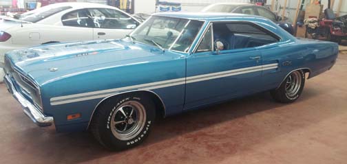 Here is Dan's story about his beautifully restored car. This car was purchased for restoration in early 2003. The car was fairly rough and in pieces. It literally came in boxes when it was purchased. However, the big attraction to this particular GTX was that it was all original and all numbers matching. The total frame up restoration began in earnest in the summer of 2003, and at the beginning of May 2004, the completed project rolled out of the shop. The complete restoration is fully documented with photos and receipts as well as written text all carefully stored in a huge album. It should be noted that not a bit of bondo was used. All body work was done with lead, as it should be. Everything that needed replaced was. All new bolts, fasteners, rubber seals, everything was returned to new, no expense being spared. The motor was rebuilt to new, the carbs were redone, the transmission was rebuilt, the rear end, clutch, brakes, trime, everything was returned to new, better than new even. In 2011, the car received a new paint again, once ore in it's original beautiful blue fire metallic. This car was stored since its rebuild in a humidity and temperature controlled building. The gentleman that owned it also owns 19 other classics including 11 winged cars (7 Superbirds and 4 Daytonas), all beautifully restored. I had been looking for a car for several years, but it is hard to come by one that is numbers matching and documented. I went to his place originally to look at a 1969 Z28, but he showed me the GTX, and after hearing them oth run, I really wanted the GTX. I was sure my wife wouldn't allow me to spend that much. However, thankfully when I told her I would buy the Z28, she told me that I had always been a Mopar guy, so buy the one that I was going to be happy with. I went right back and bought the 1970 GTX. Being documented numbers matching, it was a little pricey, but I have no regrets about buying it. It is awesome. Rubber in all 4 gears puts a big smile on my face. The car came from the factory with the standard side stripes deleted with the code V88. I thought I would like the way the white side stripes set the car off so I ordered them and had them installed. I also put the "440+6" decals on the sides of the hood, too. I think with the decal sets it looks so much better than without. The car also has headers and 3" exhaust, but I have the original manifolds if I want to back to original. It also has Chrysler electionic ignition, but have the original dual point distributor if I want to put it back. I love the car just like it is.