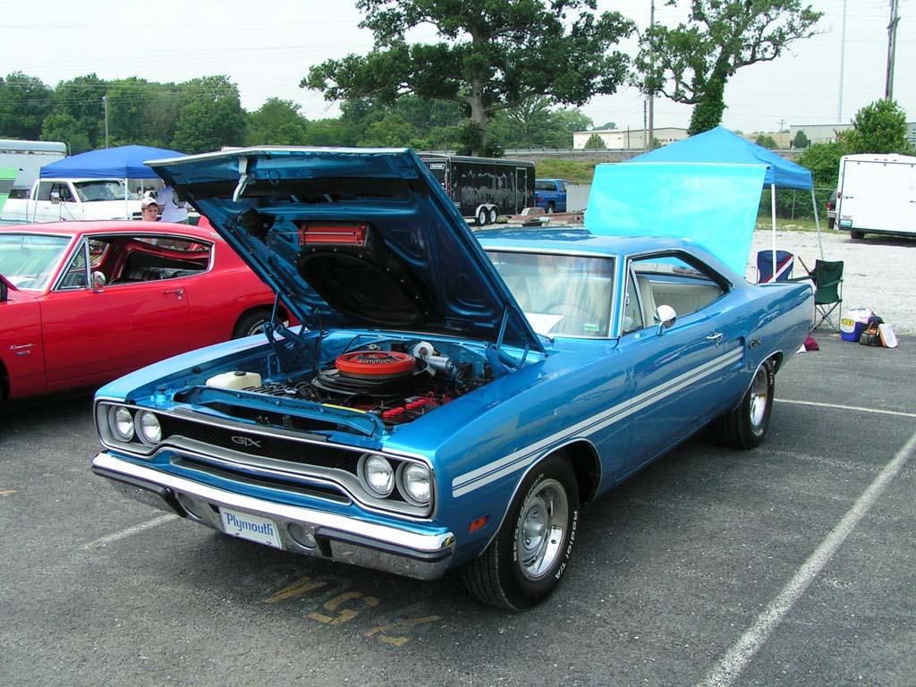 I (Dave) pruchased my 1970 GTX as a basket case in 1997 from a Southern Illinois guy hard up for quick cash. I paid $3,250 for it. With the help of some professionals, I got the car on the road for the September 2005 Monster Mopar Weekend in St. Louis, MO, even though it wasn't quite finished. Since then I have pretty much finished the project and take the GTX to shows on occasion. This GTX was ordered with the standard 440-4bbl and automatic transmission. I added an airgrabber hood setup to the car and one can't tell it wasn't factory original. I also decided to put on 15" ralleye rims, replacing the 14" road wheels. I do have both the original hood and original rims stored away. This 1970 GTX is painted EB5 blue with the white bucket seat interior, accented with the reflective side sport stiipes. It also has the V21 flat black hood performance paint treatment. Because it was rotisserie restored the GTX is pretty much like a new car from top to bottom.