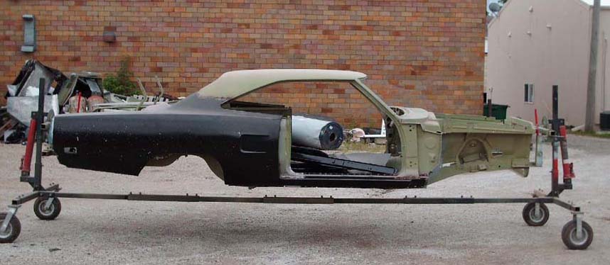 I was very pleased with the work at Total Performance. Benton had all the sheetmetal that needed replacing removed by cutting out the spotwelds. New rear quarters, lower extensions, trunkfloor, dutchman panel, rocker panels and outer wheel housing were installed. I found better quality doors, trunklid, hood and front fenders to use on the car as the replacements on the car when I got it needed quite a bit of work. Since the car had probably been junked at one time in it's life or partially parted out, mice had made nests in a number of places. This, of course, is not good especially when they nest in metal areas as their urine is very corrosive to metal. One of the metal channels under the dutchman panel had to be replaced as it had rusted through on the bottom side due to mice. The rocker panels were replaced due to damage by mice also. Even one of the front frames was found to have a weak spot that needed attention, and yes it was due to a mouse nest.