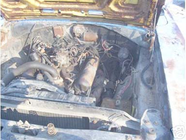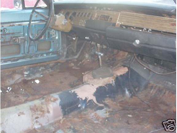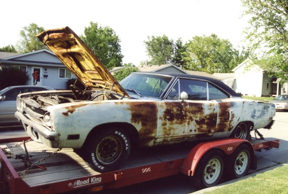 When I got the car home, I inspected it more carefully. The GTX had at least 6 metal patches screwed and rivoted together in the trunk to make a floor pan. Under the trunk floor it was discovered a non-original gas tank with straps that had the J-bolts attached near the rear bumper instead of by the rear axle. The GTX had a 19” radiator ahead of a non-running 318 with automatic transmission as well as a column shift steering column with an aftermarket floor shift coming up through the 4 speed floor opening for the 904 automatic transmission. The Dana 60 was missing, replaced by an 8 1/4” rearend. The passenger side of the car was in much better shape than the driver's side due to an NOS quarter skin being installed sometime in it's past. (Since it was rusty in the lower part it was not used in the restoration.) There were numerous places where Petty Blue paint showed through on most of the car's panels which had been sprayed with gray primer. The driver's side quarter looked the worst with some large patches having been screwed and rivoted on and a very thick layer of bondo applied. The bondo was cracking and falling out along the top edge. The front fenders were off of an FC7 purple car, the driver's door was off an EB5 blue car and the standard power bulge hood was off a yellow car!