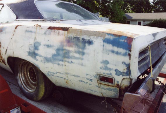 I picked up the car in June 2005 from Milt's and stopped at Sue and Ed George's in Boone, IA on the way home so they could look it over. We just quickly looked it over and it appeared to be original Petty Blue paint under the trunk lid. After removing the trunk GTX emblem, again Petty Blue was found. Also, it was observed that the car was much more damaged by rust than first thought.