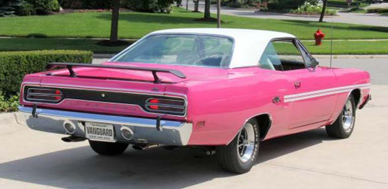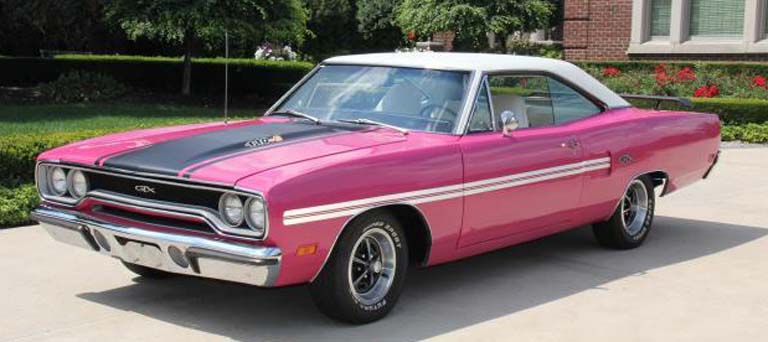 The Marlow's bought their next 1970 GTX a few years ago. Their second GTX was a rotisserie restoration. It's painted the rare FM3 moulin rouge (pink) color accented with a white vinyl top and white side stripe and a white bucket seat interior. It was an original 4 bbl car but now has a 6bbl setup and intake added. Other options include the 18 spline manual 4 speed transmission shifted with the long handled pistol grip shifter that goes back to a Dana 60 rearend with 3.54 gears. This GTX is also optioned with the J81 black rear go-wing and the V21 black hood performance paint. The odometer reads only 44,549 miles. Unfortunately the Marlow's don't have the original buildsheet or fender tag to this GTX so they would appreciate any history or paperwork on this GTX to prove it is one of the 7 FM3 painted 1970 GTXs produced. If you have info on the FM3 GTX (RS23U0A153381) please contact them via email at: serioussam1967@aol.com. Thanks.
